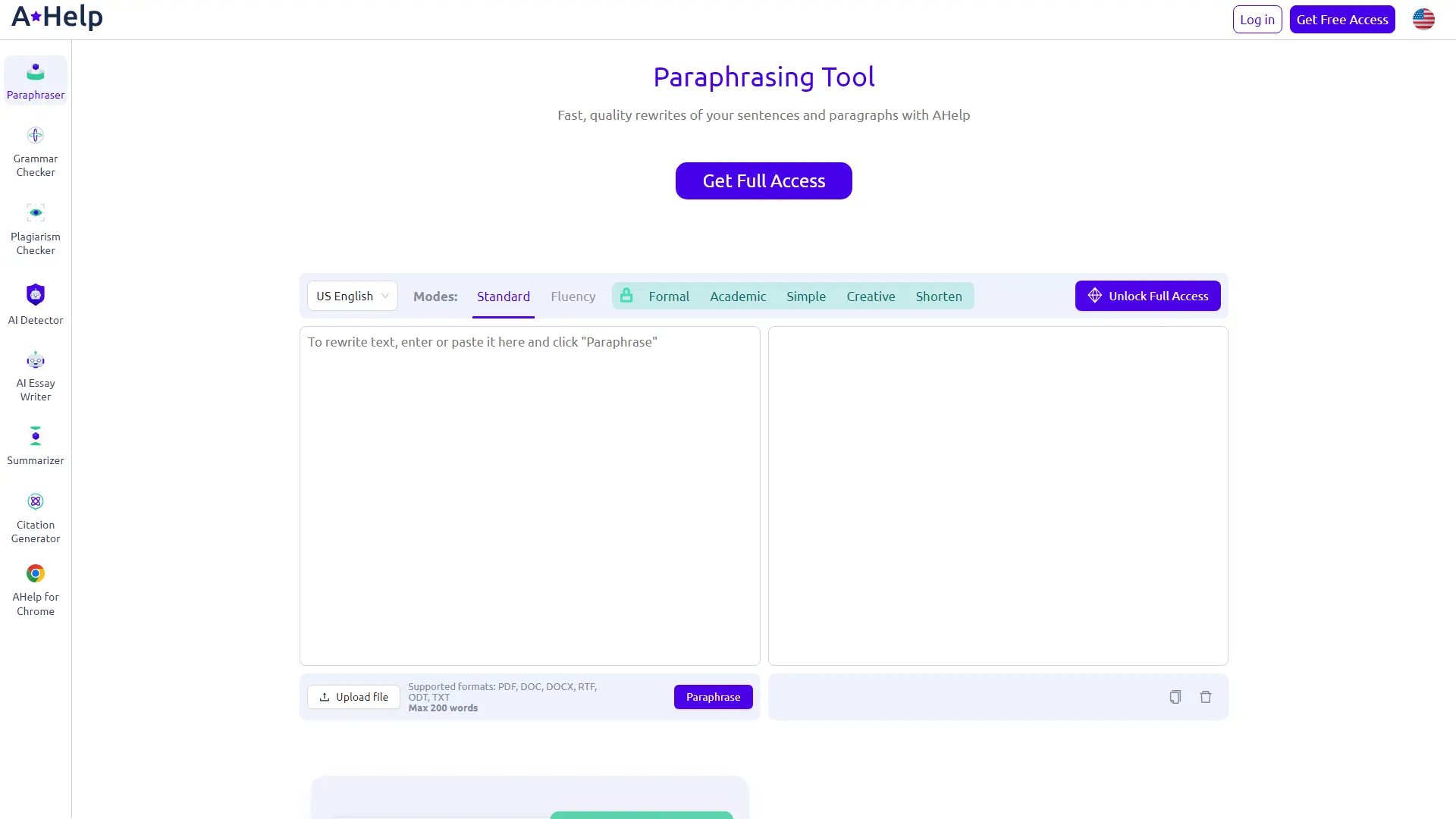 AcademicHelp Paraphraser offers two pricing tiers: free and premium. The free plan allows users to paraphrase up to 200 words with seven different modes, including standard, fluency, formal, academic, simple, creative, and shorten. It supports nine languages and multiple file formats. The premium plan removes the word limit, allowing for up to 6,000 words per paraphrase. It also unlocks all seven paraphrasing modes.Pricing Summary:Free Plan: Up to 200 words per paraphrase. Seven paraphrasing modes (standard, fluency, formal, academic, simple, creative, shorten). Nine language options. Multiple file format support.Premium Plan: Unlimited word count (up to 6,000 words). All seven paraphrasing modes.