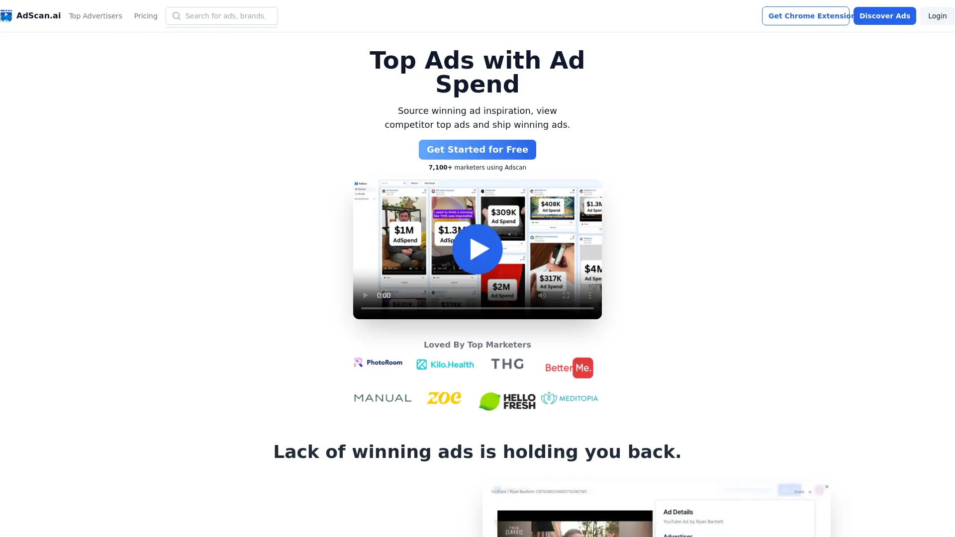 AI marketing is revolutionizing how businesses approach advertising, and AdScan.Ai is at the forefront of this change. This powerful tool empowers marketers with AI-driven insights for competitor analysis, allowing you to uncover top advertisers' pricing strategies, search for their ads, and discover winning ad inspiration. By gaining access to competitor data, including their ad spend, you can craft highly effective campaigns that maximize ROI and minimize wasted ad dollars. AdScan.Ai provides data-backed insights into ad spends and strategies, enabling you to make informed decisions that boost CPA and motivate your team. The platform's Chrome extension grants instant access to ad data from major libraries like Facebook, Google Transparency Center, and TikTok, facilitating efficient analysis of these vast resources. Join over 7,100 marketers already leveraging AdScan for comprehensive ad source coverage, collaborative ad boards, and endless inspiration through tailored searches and AI-powered analysis.