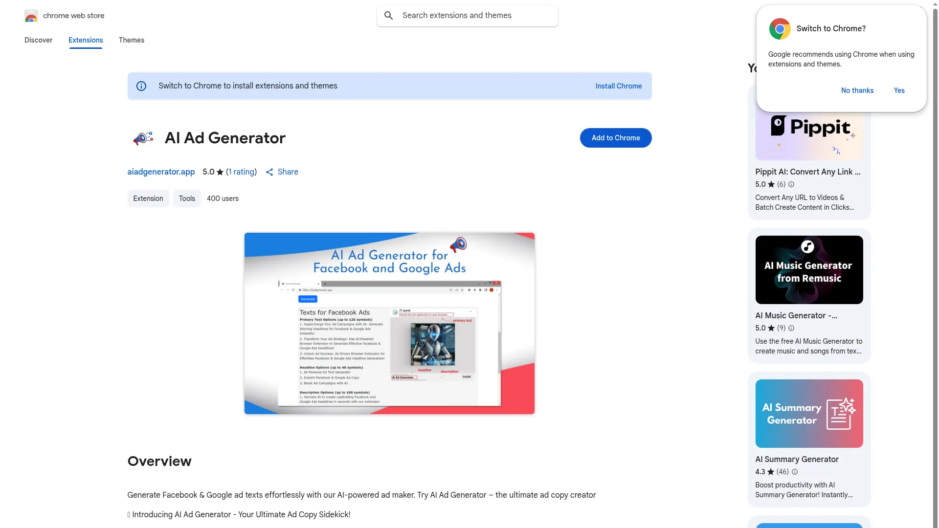 AI Ad Generator, is a revolutionary browser extension designed to simplify and supercharge your advertising efforts. This powerful tool leverages the latest AI technology to effortlessly generate compelling ad copy for both Facebook and Google Ads. By harnessing the power of AI, AI Ad Generator saves you valuable time and resources while ensuring your ads are always fresh, engaging, and optimized for conversions.