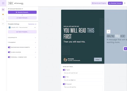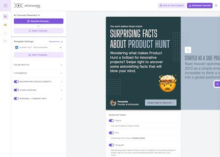 AI writing, AI content generator, AI image generator – these are the building blocks of compelling social media engagement. Crafting visually stunning carousels often feels like a chore reserved for designers, but aiCarousels.com is here to change that. Our user-friendly platform empowers you to create captivating carousels without needing any design skills. With pre-designed templates and powerful AI tools at your fingertips, you can effortlessly generate engaging content that captures attention and drives results. Let our AI writing assistant craft compelling copy while our AI image generator produces stunning visuals, all within a seamless and intuitive interface.