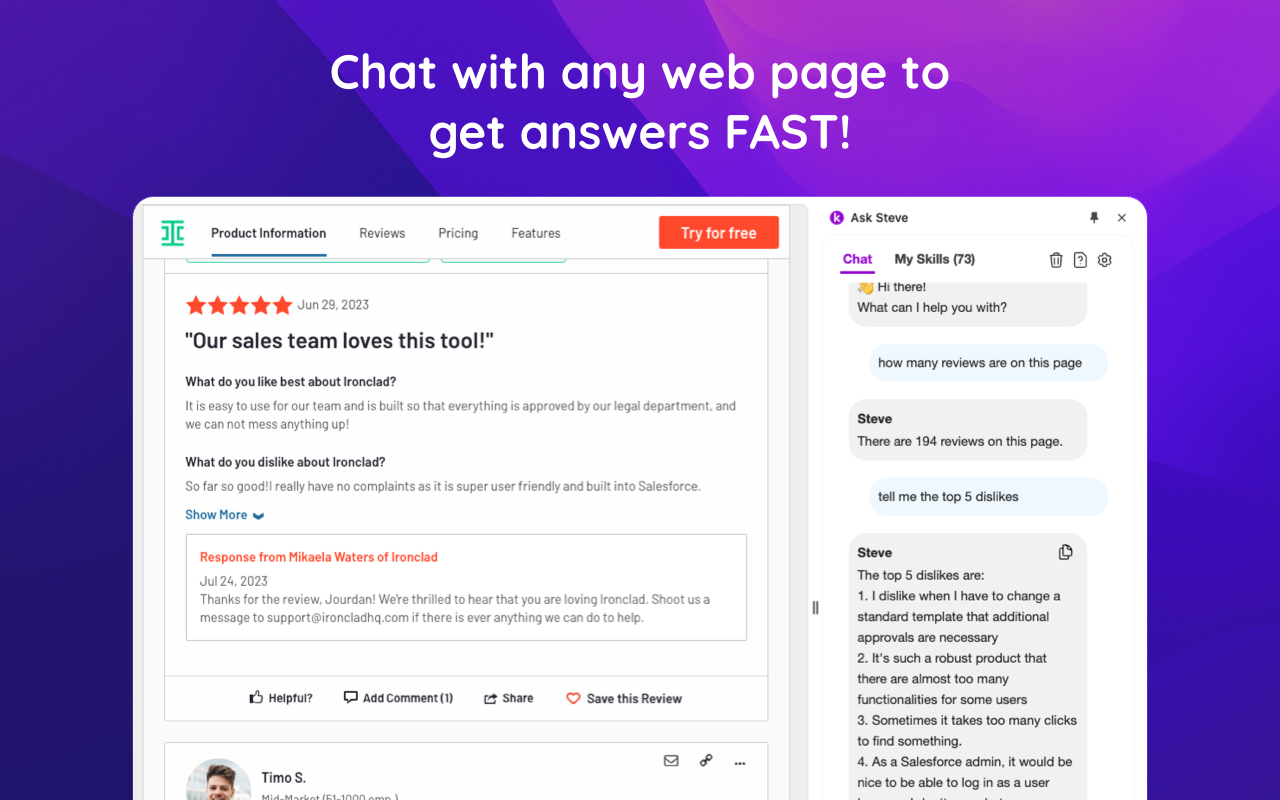 AI chatbot, ai writing, and ai assistant capabilities are revolutionizing how we interact with online information. Ask Steve seamlessly integrates these powerful technologies into any website or web application, eliminating hours of tedious tasks and boosting your productivity. This innovative tool allows you to chat with any webpage, run reusable prompts on selected content, and leverage AI for writing emails, social media posts, and more. With Ask Steve, you can select any text and instantly receive assistance, adding one-click access to AI help through customizable buttons.