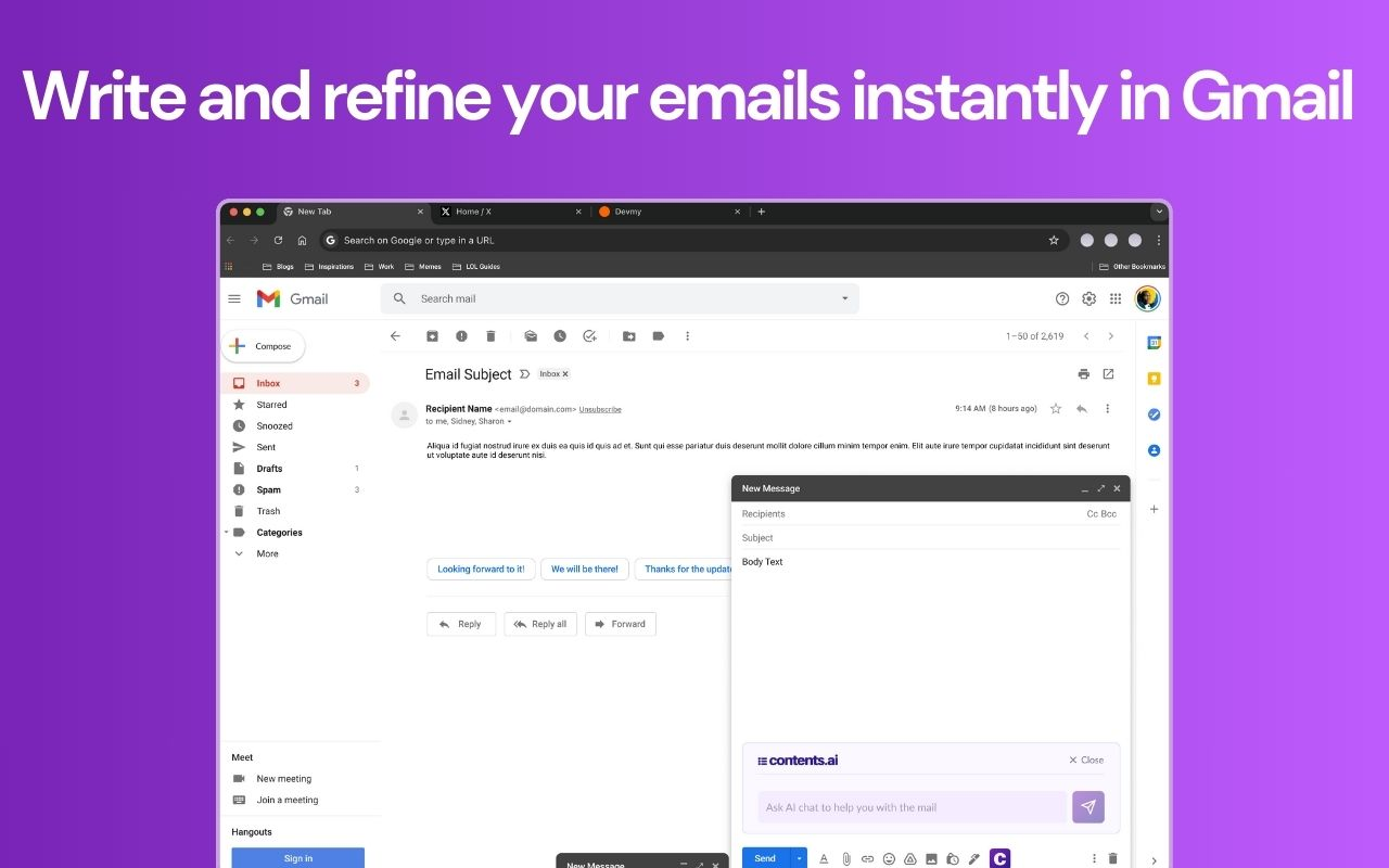 Generative AI is revolutionizing content creation, and Contents.ai takes it to the next level with its powerful Chrome extension. This innovative tool seamlessly integrates AI assistance directly into your web browser, empowering you to write more effectively and efficiently than ever before. Whether crafting compelling emails, polishing blog articles, or generating captivating social media posts, Contents.ai's real-time suggestions and optimization features ensure every word is impactful and tailored to your unique voice.