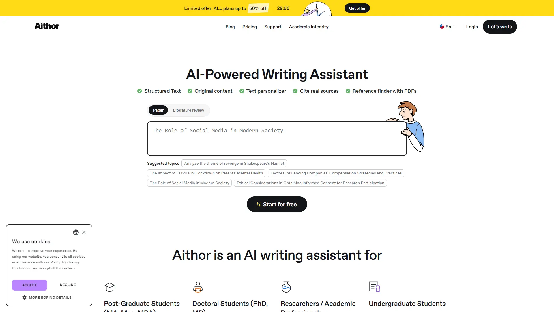 Essai.Pro offers a freemium AI writing assistant focused on academic work. Users can access core features like outline creation, content planning, and basic rewriting for free. However, to unlock advanced capabilities such as full PDF reference integration, personalized content style, and originality checks, users need to subscribe to one of their paid plans. The website doesn't explicitly list pricing details for the subscription tiers but encourages users to sign up for a free trial to experience the platform's full potential.Key Points:Freemium Model: Core features are free; advanced features require a paid subscription. Academic Focus: Designed specifically for students and researchers. AI-Powered Assistance: Helps with outlining, content planning, rewriting, and finding references. No Specific Pricing Details: Website promotes free trial but lacks clear pricing information for subscriptions.Let me know if you have any other questions.