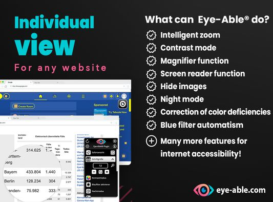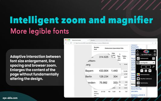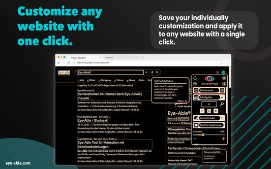 AI accessibility is changing the game, and Eye-Able® leads the charge. This innovative Chrome extension empowers everyone to experience the web in a way that suits their needs. Whether you have visual impairments, learning disabilities, or simply prefer a customized browsing experience, Eye-Able® delivers. With its intelligent font enlargement, customizable contrast modes, built-in screen reader (ai speech recognition), and keyboard navigation options, Eye-Able® breaks down barriers and ensures equal access to information for all. Experience the web like never before with Eye-Able® – your personalized window to a more inclusive online world.