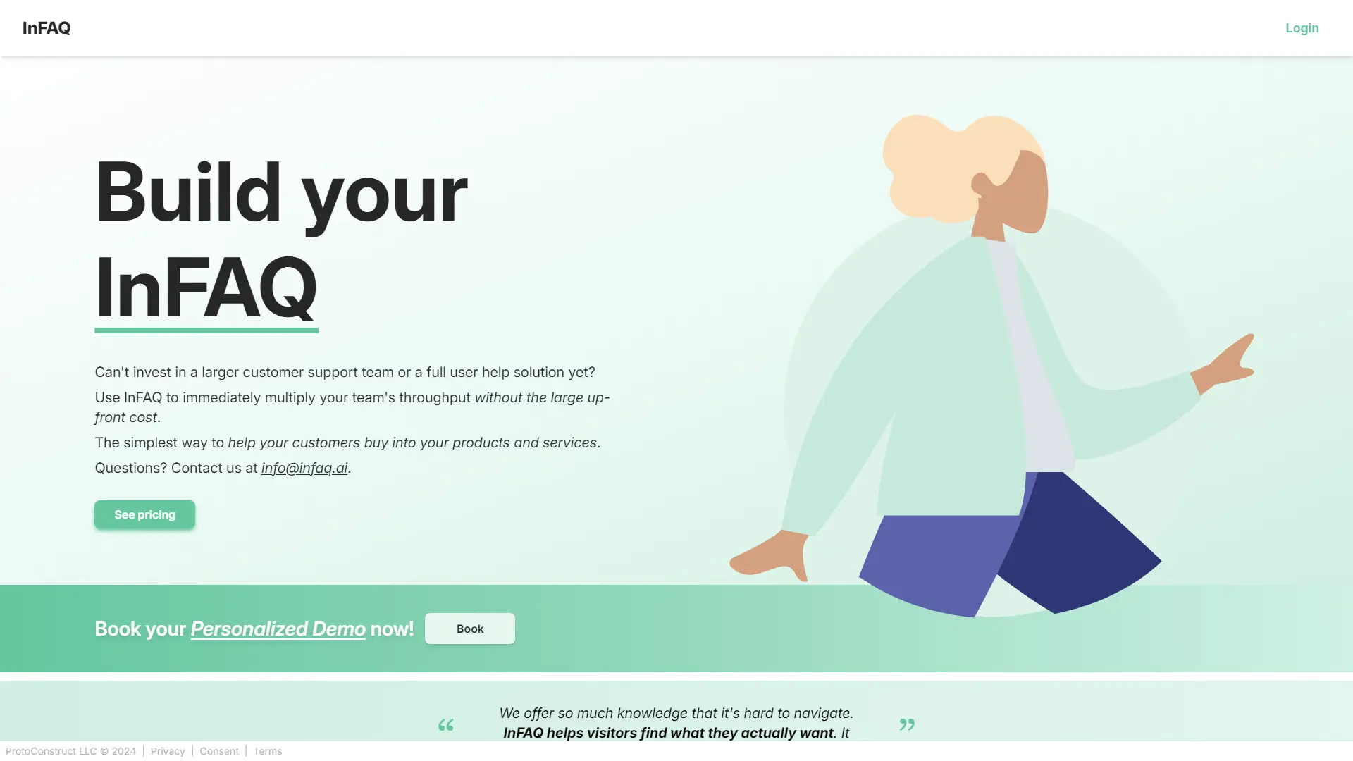 AI for customer service is revolutionizing how businesses interact with their audience, and FrequentlyAskedAI (InFAQ) leads the charge. This powerful AI tool empowers you to create an intelligent FAQ website widget that instantly answers customer questions, eliminating wait times and enhancing user experience. InFAQ's ability to generate precise responses within seconds frees up your team while simultaneously boosting customer satisfaction. By seamlessly integrating with your website, InFAQ strengthens marketing strategies, converts visitors into loyal customers, and even facilitates effortless upselling. With InFAQ, you can effortlessly collect valuable data insights to continuously refine your customer interactions, ultimately driving more leads and conversions.