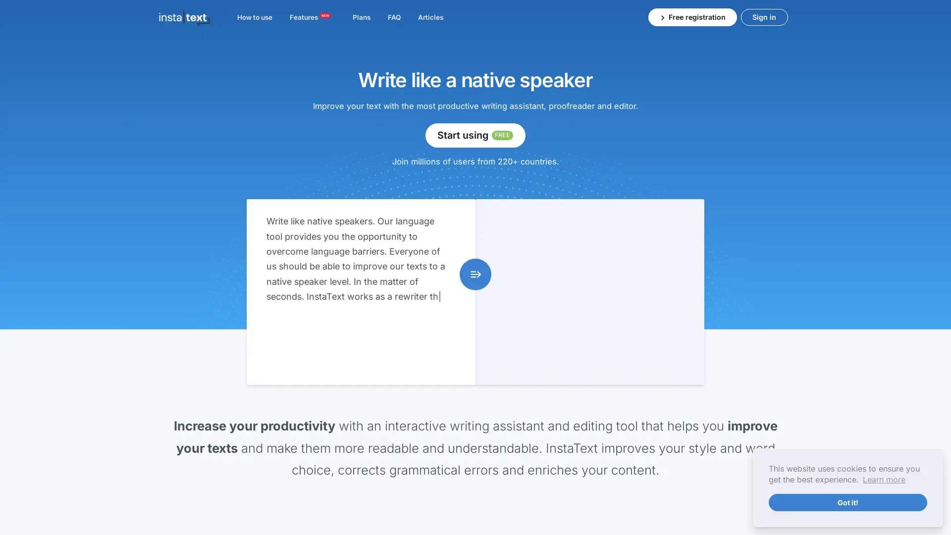 AI writing is transforming how we create and communicate. InstaText is a cutting-edge writing and editing tool that harnesses the power of artificial intelligence to elevate your text to new heights. Whether you need an AI grammar checker to polish your sentences, an AI rewriter to freshen up your content, or an AI essay writer to assist with academic assignments, InstaText delivers. This user-friendly platform improves your styling and word choice, corrects grammatical errors, and enriches your content, ensuring you are understood and perceived as a professional in every interaction. With InstaText, crafting compelling and error-free text is effortless and accessible to everyone.