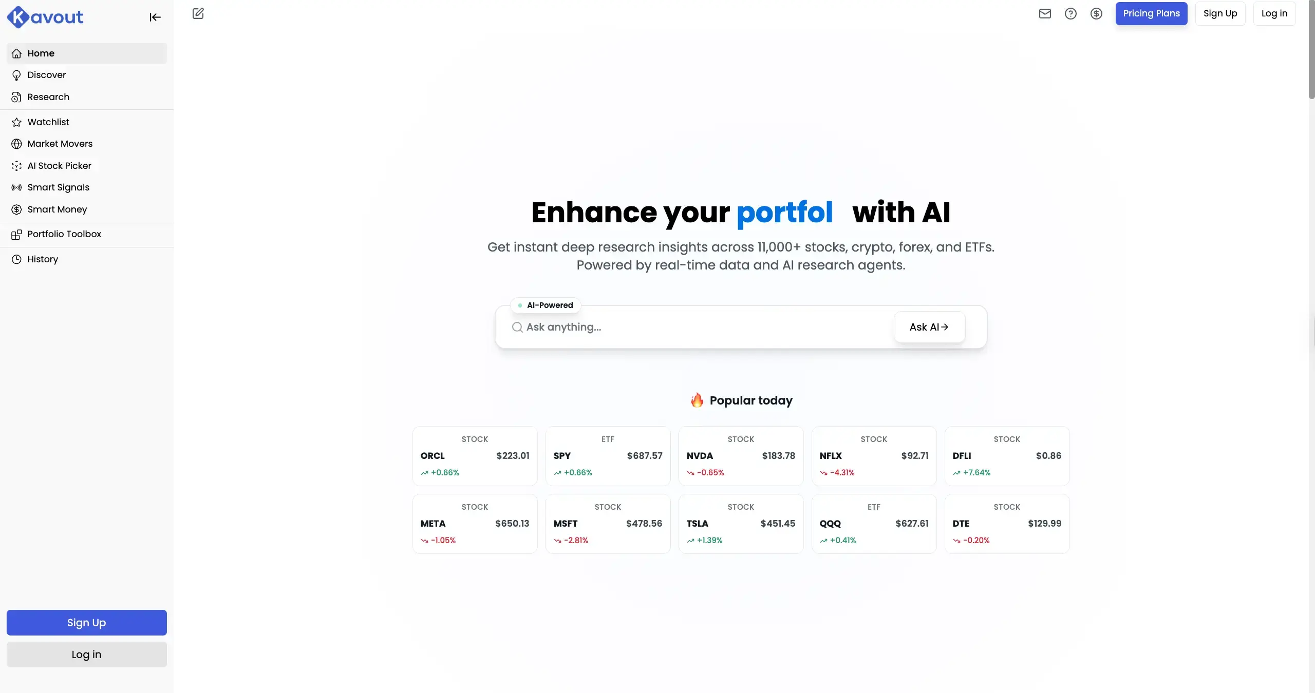 AI for finance is revolutionizing how investors make decisions, and Kavout Chat leads the charge. This powerful artificially intelligent research assistant empowers investors to uncover high-yield stock market opportunities with ease. Kavout Chat delves deep into various sectors, including the S&P 500, Nasdaq 100, Dow Jones, and Russell 1000, providing insights on individual stocks and a vast range of ETFs across diverse categories like energy, healthcare, and technology. Its intuitive platform offers seamless login and registration options, including Google sign-in for ultimate convenience. Beyond facilitating insightful chats about potential investments, Kavout Chat boasts a comprehensive database of stock and ETF movers, highlighting top gainers, losers, and stocks reaching 52-week highs and lows. By providing robust and accessible investment analysis, Kavout Chat helps users identify their next winning investment with confidence.