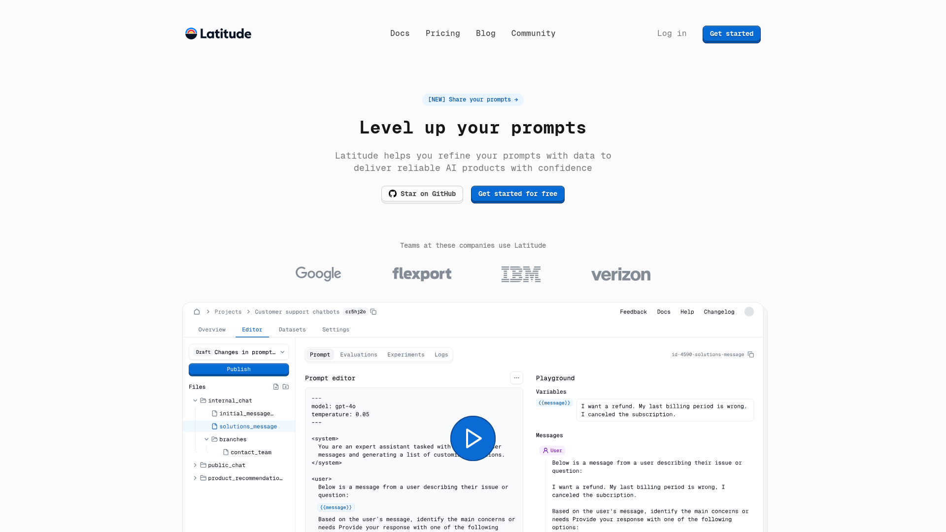 Latitude offers a freemium pricing structure. Their "Hobby" plan is free and includes up to 40,000 prompt and evaluation runs per month, basic logging, and access for up to 5 users. For increased usage, you can upgrade to the "Team" plan starting at $99/month, offering 100,000 runs per month, unlimited log access, and support for more users ($20 per additional user). An "Enterprise" plan with custom pricing is available for unlimited users, runs, and log access.Here's a summary of the key points:Hobby Plan: Free Up to 40,000 runs/month Basic logging (30-day access) Up to 5 users Team Plan: $99/month Up to 100,000 runs/month Unlimited log access Supports more users ($20 per additional user) Enterprise Plan: Custom pricing Unlimited users Unlimited runs/month Unlimited log access