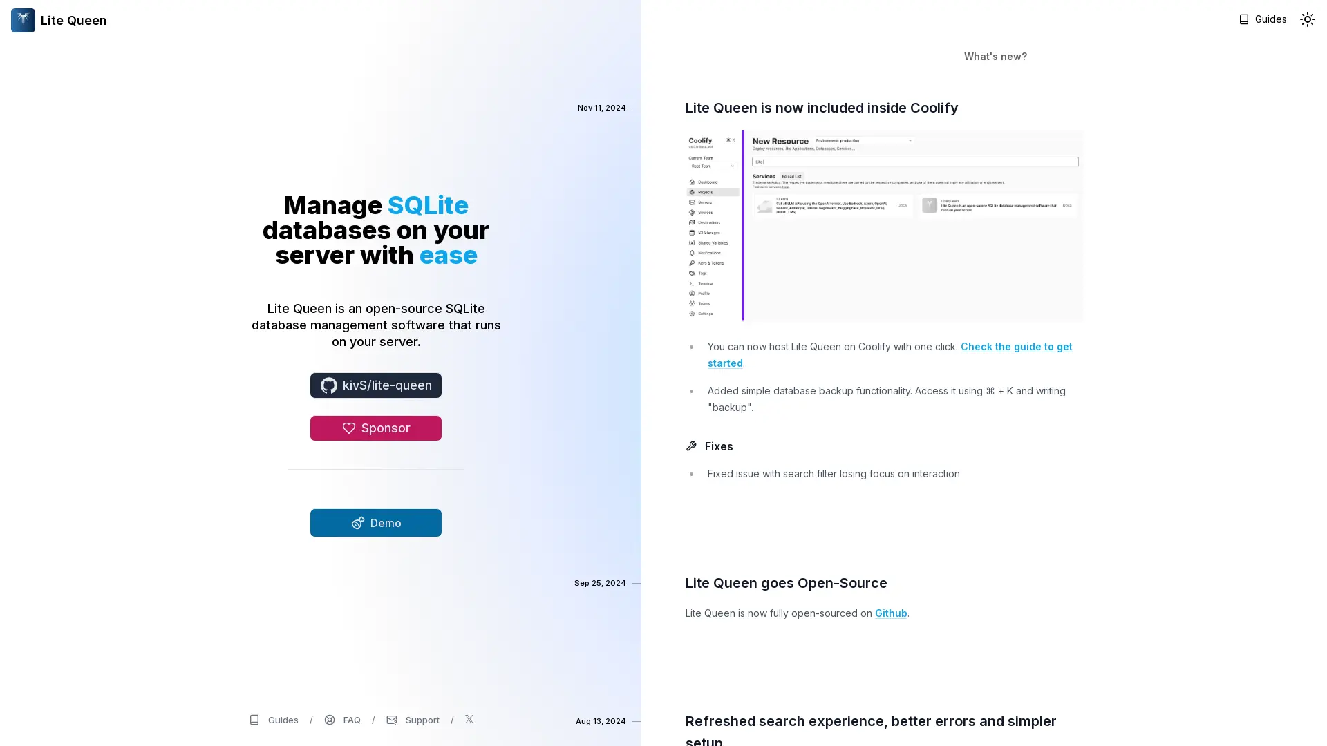 AI and big data are transforming how we interact with information, and managing databases efficiently is crucial in this landscape. Enter Lite Queen, an open-source SQLite database management tool designed for simplicity and power. Lite Queen streamlines database server management with a user-friendly interface, intuitive schema visualization, and a revamped search experience. Leveraging the capabilities of OpenAI, its "god mode" allows users to interact with databases using natural language queries, enhancing accuracy and efficiency. From customizable table displays to adjustable text dialogs for large content editing, Lite Queen empowers users to manage SQLite databases with ease and precision.
