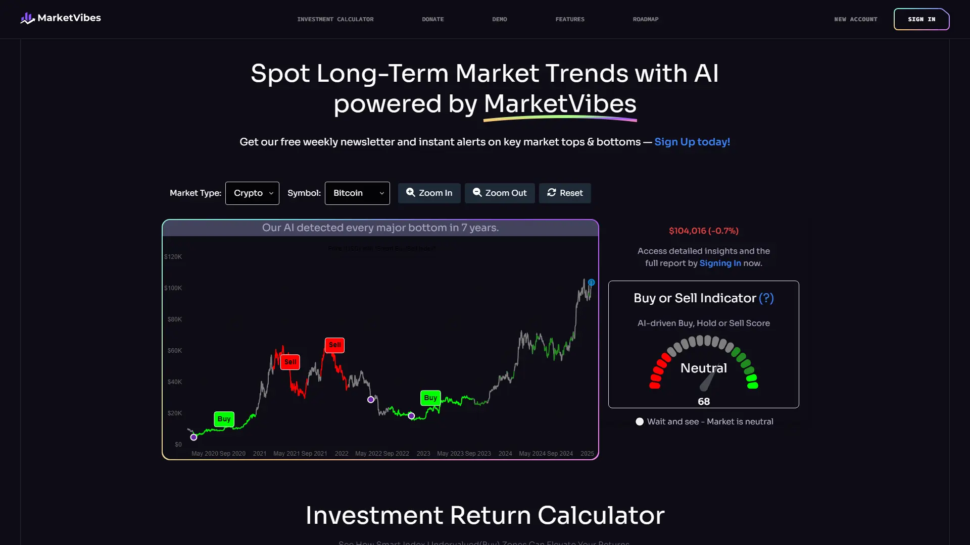 AI for investment is revolutionizing the way we approach financial markets, and MarketVibes stands at the forefront of this transformation. This powerful AI-powered investment calculator is designed specifically for cryptocurrency enthusiasts, offering in-depth insights and analysis for popular cryptocurrencies like Bitcoin and Ethereum. By leveraging technical indicators such as trading volume and moving averages, MarketVibes generates buy/sell scores to help you identify optimal buying opportunities. Its user-friendly color-coded smart index highlights critical market events and actions, keeping you informed and ahead of the curve. With its investment return calculator, you can simulate various investment scenarios and forecast potential returns based on your contributions, empowering you to make smarter, data-driven decisions in the dynamic world of cryptocurrency trading.