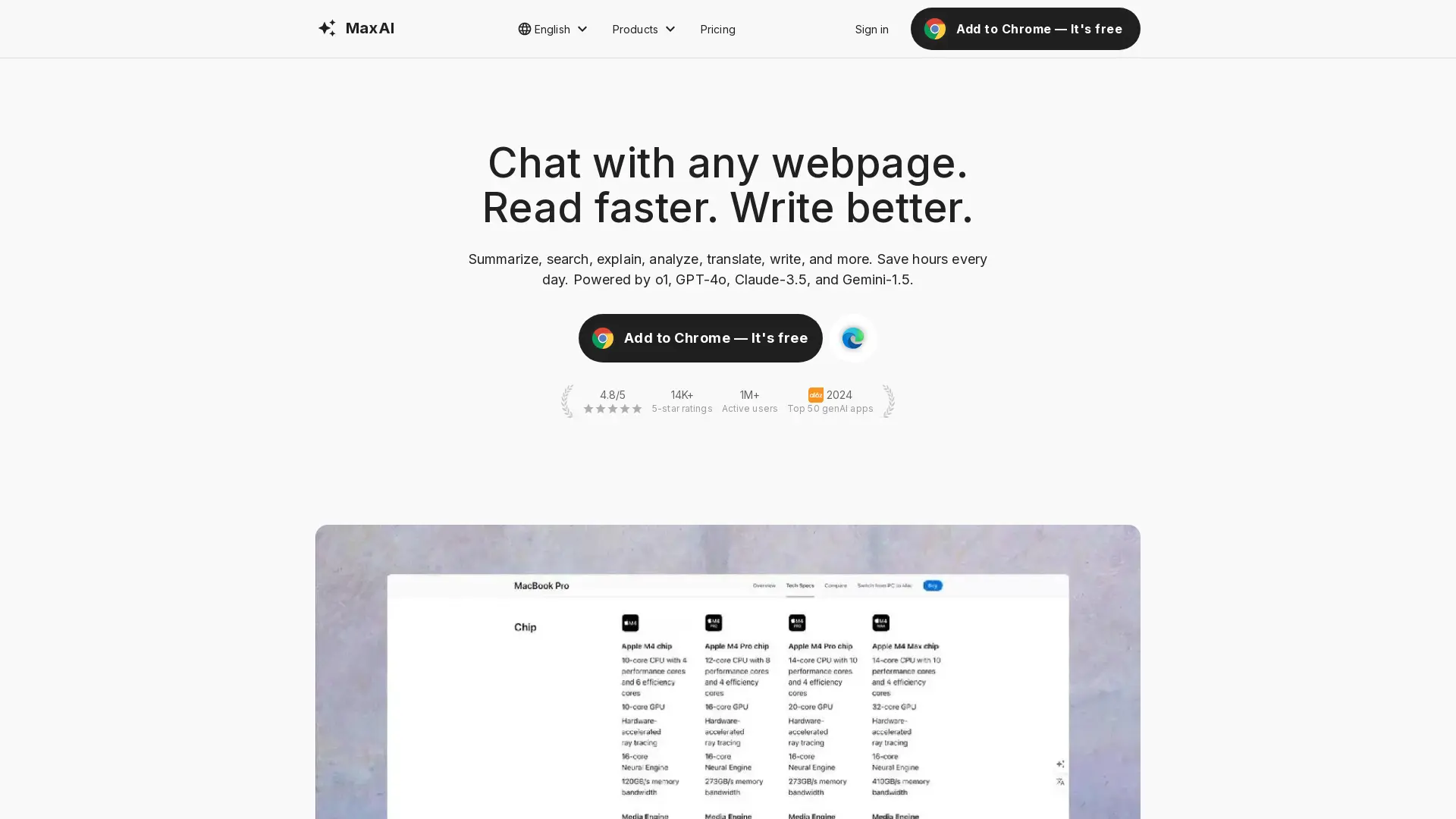 AI assistants like ChatGPT, Claude, Gemini, Bard, and Bing are transforming how we work and learn. MaxAI.Me takes this revolution a step further by offering users seamless one-click access to these powerful AI models directly within their browser. This innovative extension empowers you to harness the capabilities of AI grammar checkers, AI writing tools, AI translators, AI summarizers, and more – all with a single click. Whether you're streamlining your workflow, boosting productivity, or simply looking for a smarter way to interact with online content, MaxAI.Me provides a versatile platform to elevate your digital experience across various applications.