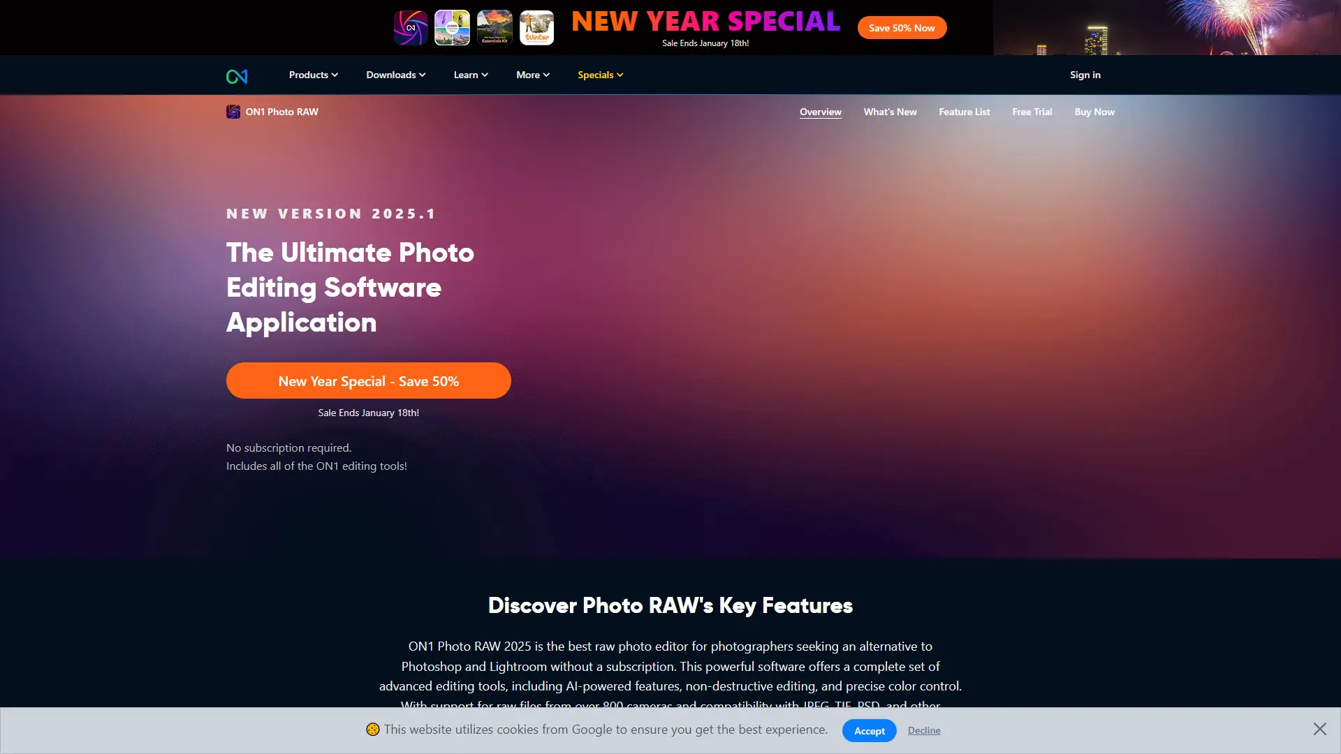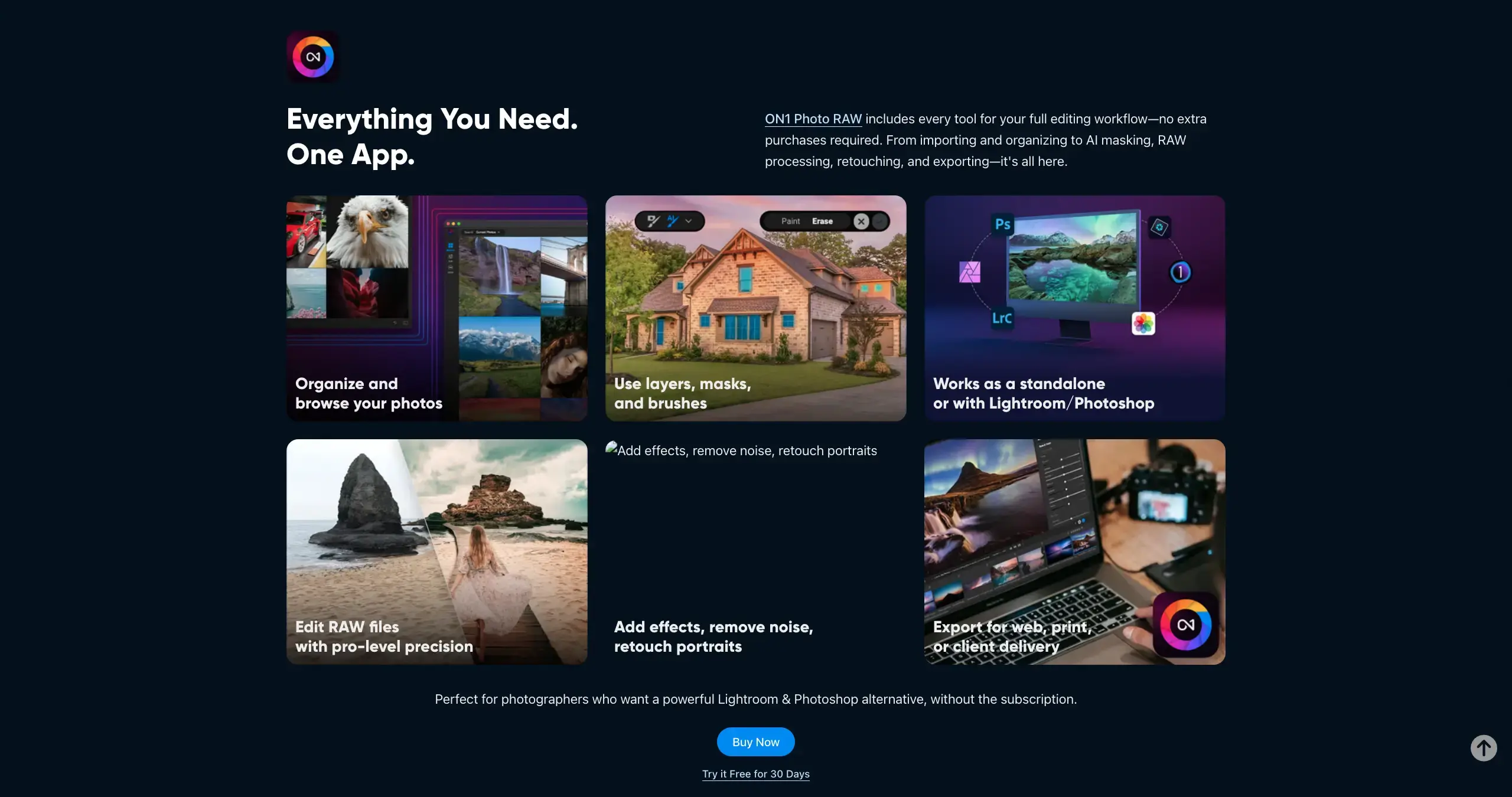 ON1 Photo RAW offers two pricing options: a one-time purchase or a yearly subscription. The one-time purchase costs $99.99 and grants perpetual access to the software as a standalone app. The yearly subscription, "ON1 Everything," costs $49.99 for the first year and includes ON1 Photo RAW Max (with plugin support for Photoshop and Lightroom), 200GB of cloud storage, all future upgrades, and activation on two computers. Both options include a 30-day money-back guarantee.Here's a breakdown:One-Time Purchase: Price: $99.99 Perpetual access to software Standalone app only Yearly Subscription (ON1 Everything): Price: $49.99 for the first year Includes ON1 Photo RAW Max (plugin support) 200GB of cloud storage All future upgrades Activation on two computers