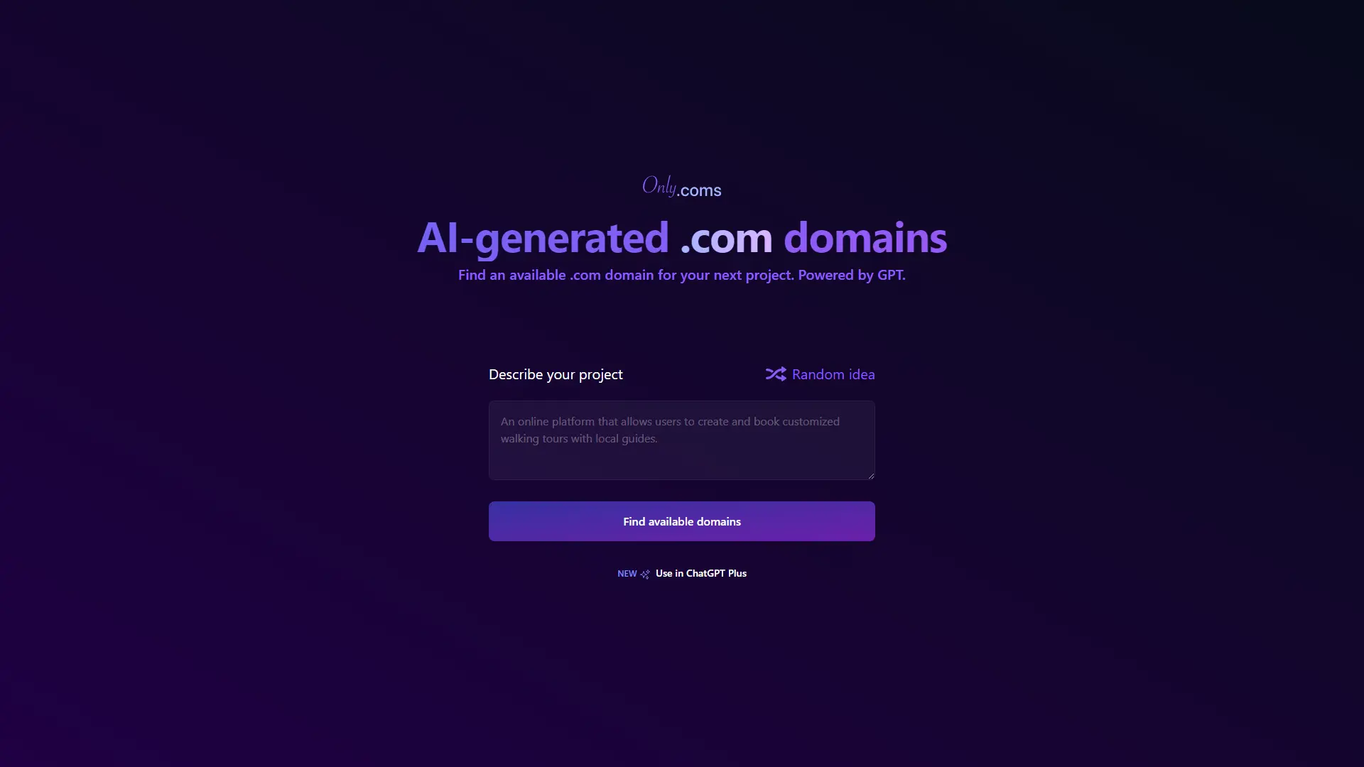 AI For Branding: Onlycoms.Com makes finding the perfect .com domain a breeze. This innovative platform leverages the power of AI to generate unique and available .com domain suggestions tailored to your project's essence. Simply describe your project, and Onlycoms will provide you with a list of relevant and catchy domain names ready for registration. By utilizing ChatGPT technology, Onlycoms ensures that the generated suggestions are both creative and commercially viable, saving you valuable time and effort in the often tedious process of domain name discovery.