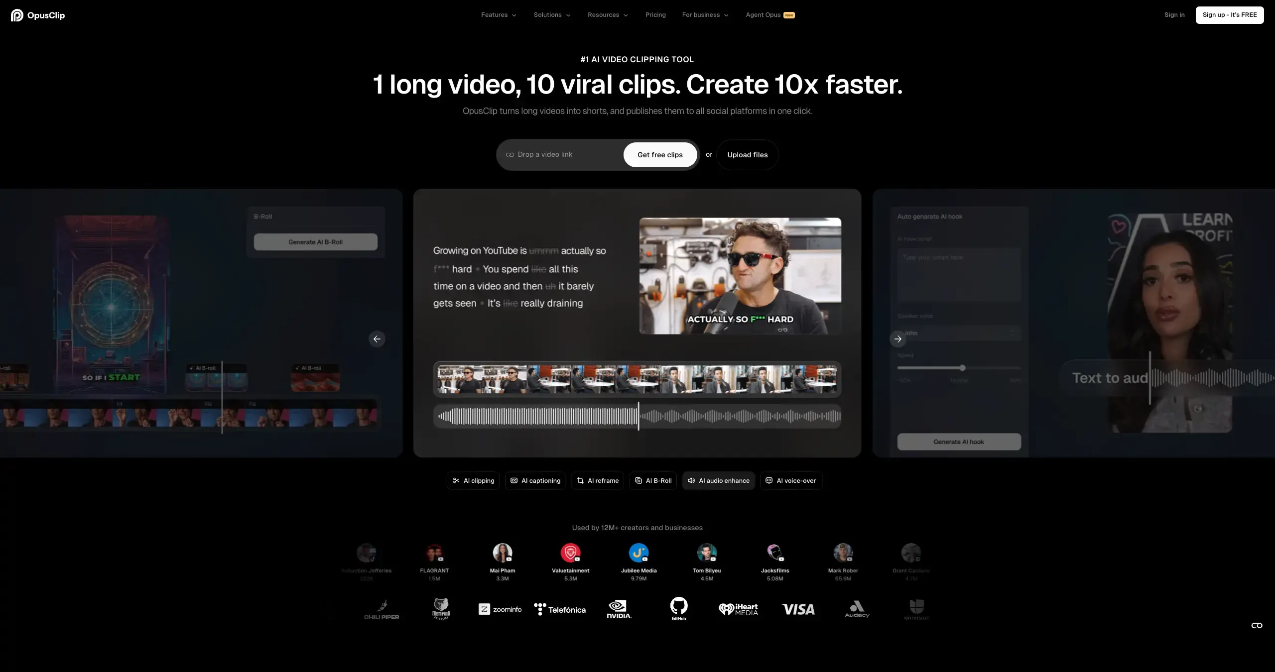 AI video generator, generative AI, and ai video editor are no longer futuristic concepts; they're here, and they're revolutionizing how we create content. OpusClip is at the forefront of this revolution, empowering creators, editors, agencies, and marketers with a powerful tool that turns long videos into captivating short-form content in just one click. With over 1 million users already harnessing its potential, OpusClip simplifies the video creation process, allowing everyone to tell their story through engaging short videos and boost their ai marketing efforts. OpusClip's intuitive interface and cutting-edge technology make it easy to generate high-quality, shareable content that captures attention and drives results – all while saving valuable time and resources.