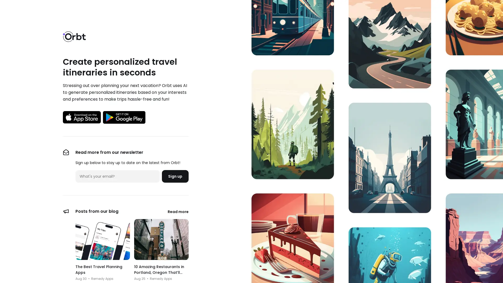 AI trip planner Orbt is revolutionizing how you approach travel. We aim to be your one-stop shop for all things travel, starting with our cutting-edge AI-powered itinerary generator. Simply answer a few simple prompts, and Orbt will craft a personalized itinerary tailored to your interests, budget, and desired pace. Say goodbye to hours of tedious research and hello to stress-free travel planning. With Orbt, you can discover hidden gems, optimize your time, and create unforgettable memories with ease.