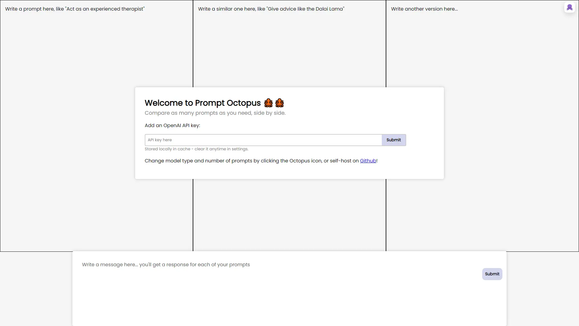 AI assistants, AI development, and AI for integration are revolutionizing how we interact with technology. Prompt Octopus empowers users to take control of their AI journey by offering a powerful tool for side-by-side prompt engineering. This intuitive platform allows you to compare the responses generated by different prompts simultaneously, streamlining your workflow and accelerating your AI development process. With seamless OpenAI API integration, secure local key storage, and customizable model selection, Prompt Octopus puts the power of precise prompt crafting directly at your fingertips. Whether you're a seasoned developer or just starting your AI exploration, this tool simplifies the process of generating and evaluating prompts, ultimately leading to more effective and insightful AI interactions.