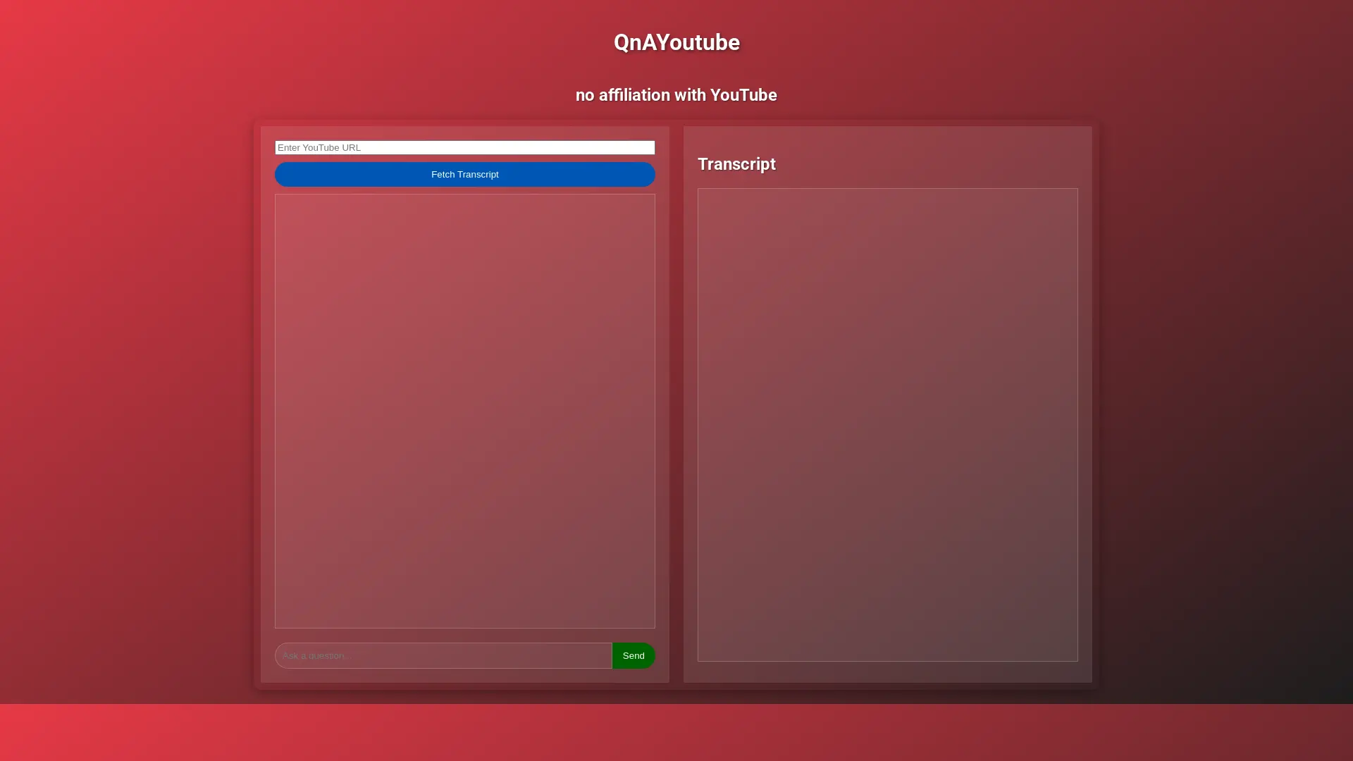 AI transcription, AI voice chat generator, and AI question answering are revolutionizing how we interact with video content. QnAYoutube takes this to the next level by seamlessly integrating these technologies into your YouTube experience. This powerful AI tool is designed to streamline the process of extracting, sending, and analyzing YouTube video transcripts. With QnAYoutube, users can effortlessly fetch transcripts from any YouTube video, making it significantly easier to analyze content for research, education, or simply understanding a video's key points. The tool also allows for seamless transcript sharing, enabling users to collaborate and discuss insights derived from the analyzed videos. By combining AI transcription with the intuitive functionality of QnAYoutube, users can unlock valuable insights and streamline their content analysis workflow.