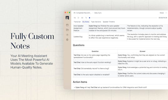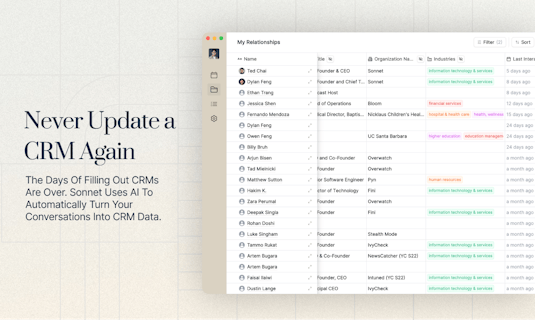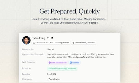 AI meeting assistants like Sonnet are transforming the way we work. Sonnet is your end-to-end AI meeting assistant, designed to empower you with smarter conversations and increased productivity. This innovative tool provides pre-meeting briefs powered by natural language processing (NLP), ensuring everyone is on the same page from the start. Sonnet also generates customizable AI-generated notes, capturing key insights and action items automatically, eliminating tedious note-taking. Furthermore, it offers fully automated CRM integration, streamlining your workflow and keeping customer data up to date effortlessly. With Sonnet, you can say goodbye to meeting fatigue and hello to efficient, impactful collaborations.