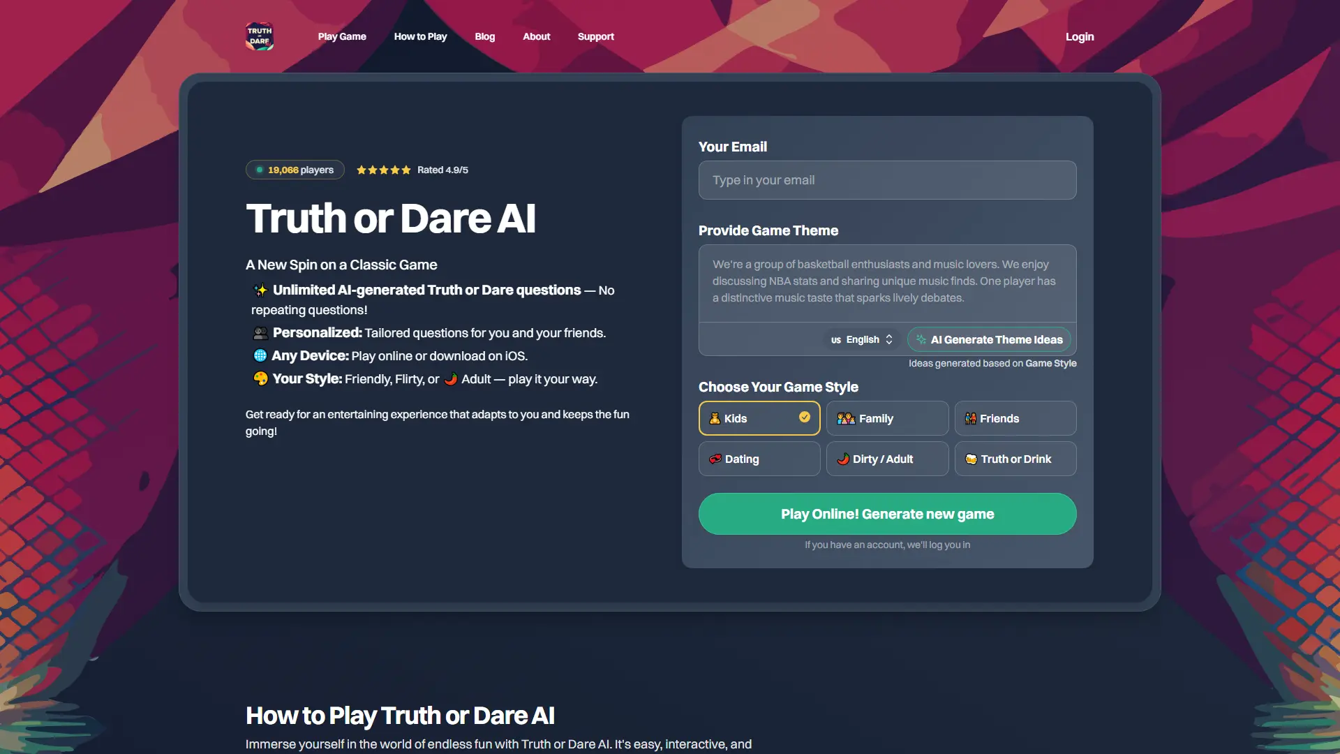 AI for fun takes on a whole new meaning with Truth Or Dare AI, a revolutionary tool that breathes fresh life into the classic party game. Truth Or Dare AI offers an endless supply of AI-generated truth and dare prompts, ensuring a unique and exciting experience every time you play. This interactive tool personalizes questions based on your preferences and settings, guaranteeing laughter, gasps, and unforgettable memories whether you're hosting a festive gathering or having a casual hangout with friends. From family-friendly to adult-themed game styles, Truth Or Dare AI caters to diverse occasions, making it the perfect choice for solo play or group activities.