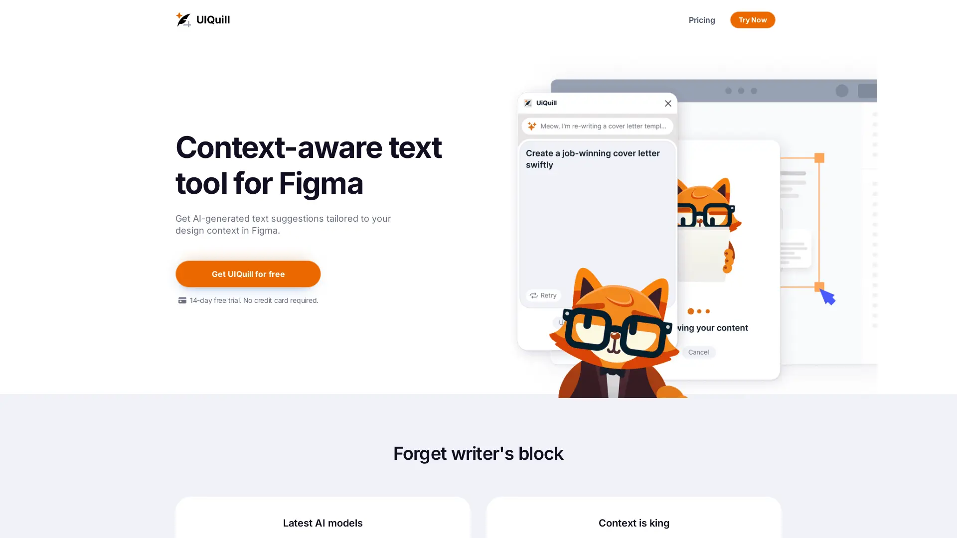 Uiquill offers a freemium pricing structure for its AI-powered text generation tool integrated with Figma. A 14-day free trial is available without needing a credit card. After the trial, users can choose between two subscription plans: a monthly Premium plan at $9/month or a one-time Premium Lifetime payment of $299. The Premium plans provide unlimited usage and access to the latest AI models, along with early-bird features.Here are the key points in bullet format:Free Trial: 14 days free, no credit card required Premium Plans: Monthly: $9/month Lifetime: $299 one-time payment Plan Benefits: Unlimited usage Latest AI models Early-bird features (access to updates)