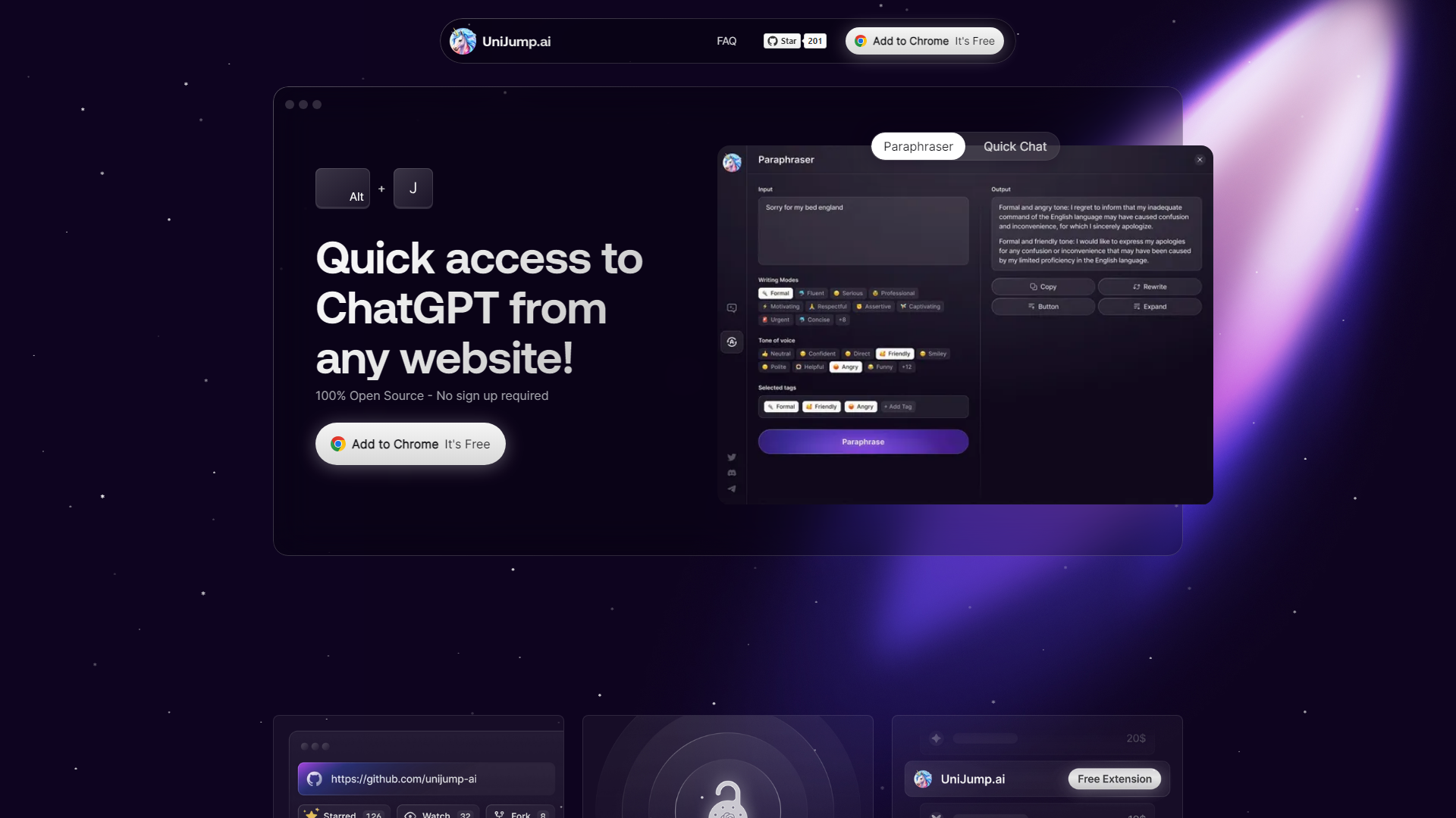AI paraphraser, natural language processing, and AI tools are constantly evolving, making our digital lives easier and more efficient. Enter UniJump, a free and open-source browser extension that supercharges your ChatGPT experience. UniJump seamlessly integrates with the ChatGPT website, providing quick access to its powerful features directly from any webpage. Whether you need help brainstorming content ideas, refining your writing style, or answering tricky questions, UniJump empowers you with AI-driven assistance at your fingertips. UniJump's intuitive design and user-friendly interface ensure a smooth and effortless experience, while its commitment to transparency and data privacy puts you in control. Explore the world of AI-powered communication with UniJump – download it today and unlock the full potential of ChatGPT!